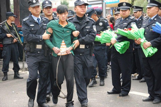 在审讯中,杨何建交待说,2012年11月3日,杨何建因与妻子曾庆芬发生矛盾,遂用皮带将其妻子曾庆芬勒死,并电话邀约自好杨某辉到其家中,商量如何抛余下的两袋尸块。商量妥当后,杨某建于当晚将装有头颅的口袋抛到距自己家200米远的高速路排水沟内。并于11月4日和杨某辉一起在县城将曾某银行卡上的5500元存款取走,之后二人将另一袋装有其他尸骨的口袋抛弃。图为10月27日,主犯杨何建在通报会现场。