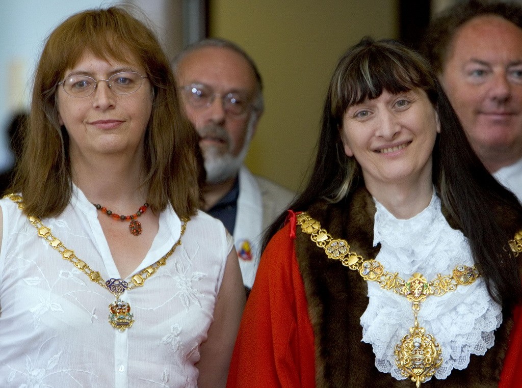 当地时间2007年5月24日,英国剑桥,首位变性市长詹妮·贝利(右)与同是变性人的市长夫人利德尔。两人对政治都很感兴趣,并先后当选为剑桥市议员。但为了照顾好家庭,利德尔没有参加今年的市议员竞选,转而当起了“贤内助”。在她的支持下,贝利成功当选剑桥市第801任市长。