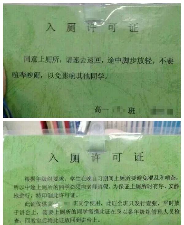 10月31日下午,认证微博“南昌校园”发帖称:江西萍乡上栗中学向每个班级发“入厕许可证”,平时放讲台,需要上厕所的同学需携带“入厕许可证”上厕所以备管理人员检查。 @南昌校园 图