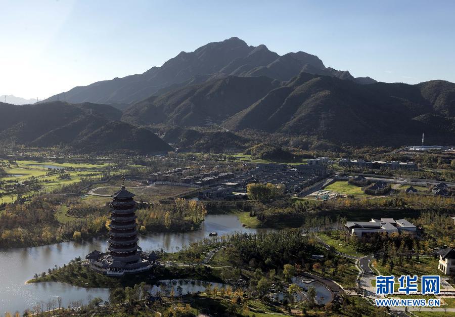 这是航拍的怀柔雁栖湖国际会展中心(10月26日摄)。 2014年亚太经合组织(APEC)领导人会议周活动将于11月5日至11日在北京举行。 新华社发(马文晓 摄)