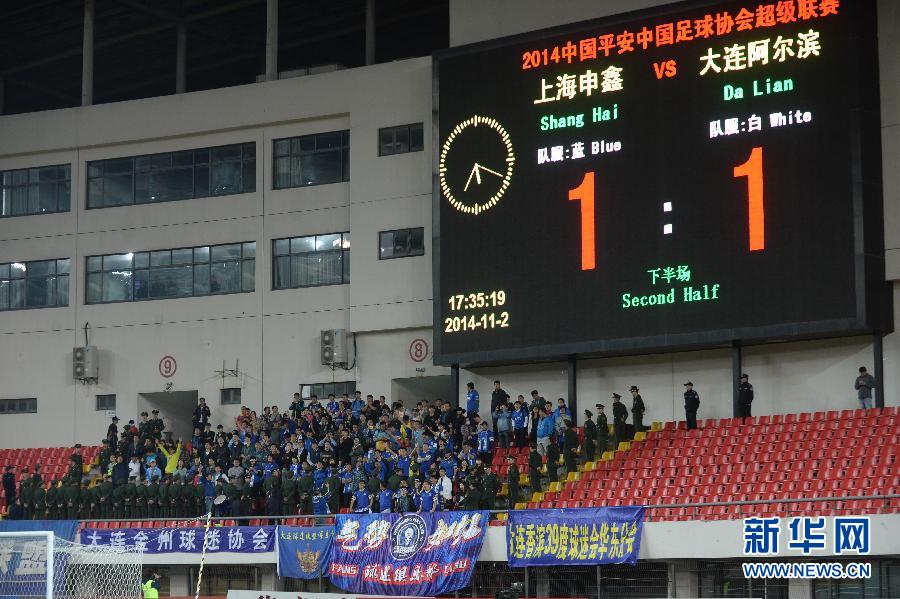 11月2日,赛后大连阿尔滨队球迷不愿离场。当日,在2014中超联赛第30轮比赛中,大连阿尔滨队客场以1比1战平上海申鑫队,大连阿尔滨队降级。 新华社记者潘昱龙摄