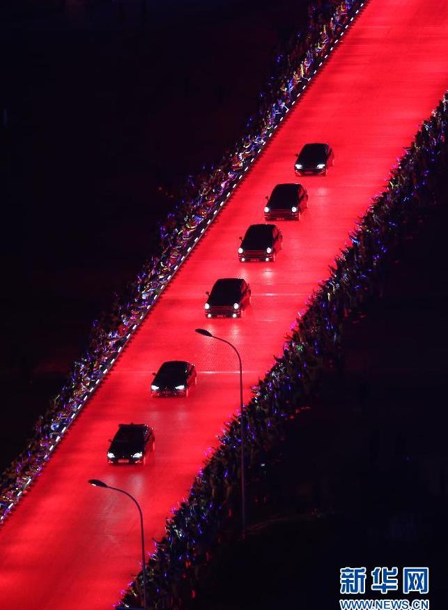 11月10日晚,出席亚太经合组织领导人非正式会议的经济体领导人和代表车队抵达北京国家游泳中心“水立方”。当晚,2014年APEC领导人欢迎宴会在北京国家游泳中心“水立方”举行。 新华社记者 金立旺 摄