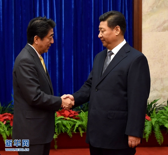 11月10日,国家主席习近平在北京人民大会堂应约会见来华出席亚太经合组织领导人非正式会议的日本首相安倍晋三。