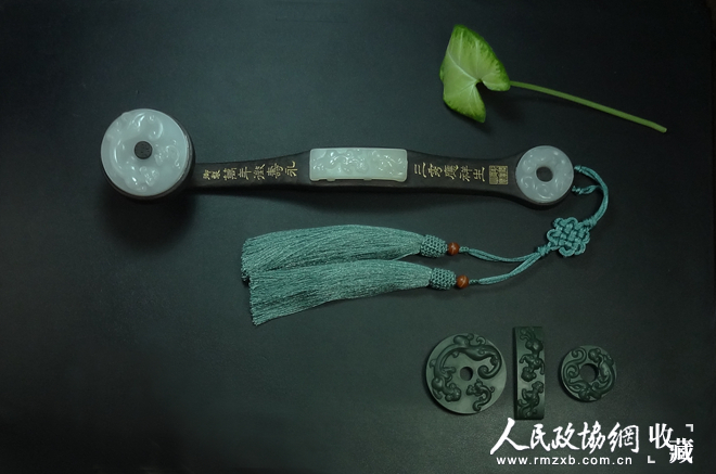 檀木嵌玉双螭纹三镶如意