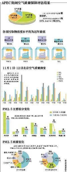 昨日,北京市环保局通报了APEC会议空气质量保障措施效果初步评估结果。结果显示,1日至12日,空气质量的优良率达到92%,PM2.5比去年同期下降55%。另据初步统计,京津冀及周边地区的PM2.5平均浓度同比下降29%左右。
