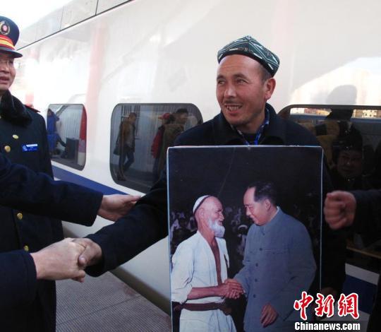 1950年代,新疆和田地区农民库尔班·吐鲁木要骑毛驴到北京见毛泽东的故事在中国流传很广。在高铁通车之际,库尔班的孙子亚生·买买提明,怀抱着镶嵌当年毛泽东接见库尔班·吐鲁木照片的镜框,登上了高铁列车。闫文陆摄