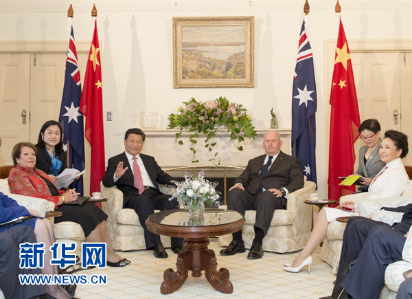 习近平表示,总督先生强调澳方把发展对华关系放在优先位置,我对此高度赞赏。我第一次访问澳大利亚是在1988年,今天两国合作领域之宽、程度之深是26年前难以想象的。我期待通过这次访问,加深对澳大利亚的了解。我们决定把双边关系定位提升为全面战略伙伴关系,宣布实质性结束中澳自由贸易协定谈判,揭开了两国友好合作新篇章。展望未来,中澳关系前景光明。