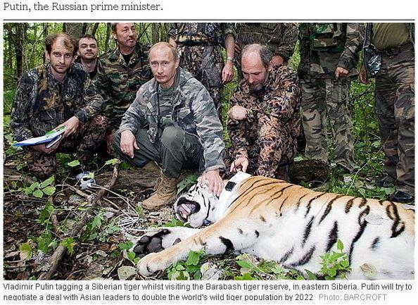 2013年夏天,在普京的提议下,俄罗斯成立了阿穆尔虎(编者注:阿穆尔虎,在俄罗斯又称西伯利亚虎,在中国有东北虎之称)中心。2014年5月,普京到访阿穆尔州自然?;で涂蒲Ъ乙黄鸱派巳辉谡饫锼茄亩被?,它们分别叫做“鲍里亚”、“伊洛娜”和“库贾”。科学家们给老虎套上了GPS项圈,以便观察它们的行踪。