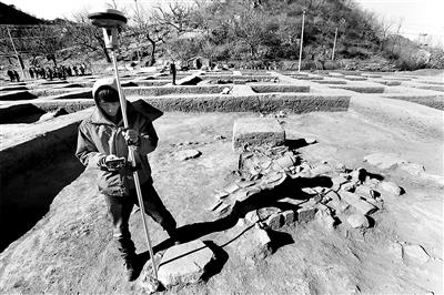 昨天上午,在延庆大庄科矿冶遗址群考古现场,黄土地面已被划成了30多个方形“坑”,一些石块散落其中。这里就是辽代“首钢”的生活区,相当于当时冶铁工人的“宿舍”,是近三年对大庄科矿冶遗址群勘探考古后的最新发现。