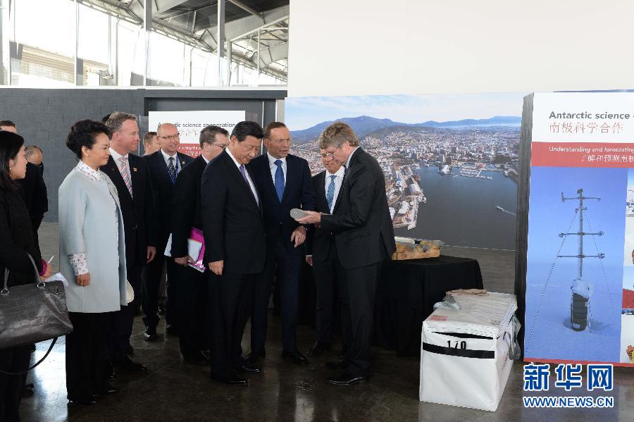 习近平和阿博特来到霍巴特港区,参观了澳大利亚南极科考展览,并通过视频连线同中澳南极科考站工作人员通话。中国中山南极科考站、澳大利亚戴维斯南极科考站负责人分别汇报工作。