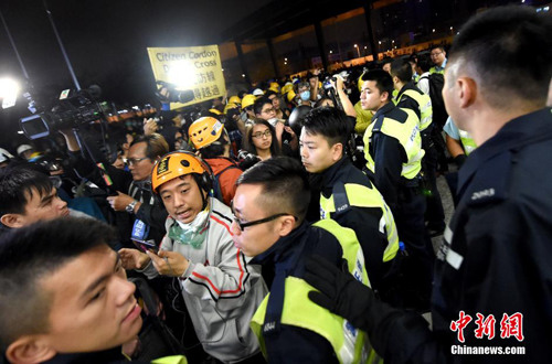 警方应立法会要求到场协助。示威者又企图阻止警方执法。