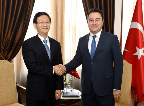 11月18日至19日,习近平主席特使、中共中央政治局委员、中央政法委书记孟建柱对土耳其进行访问。图为11月19日,土耳其副总理巴巴詹在安卡拉会见孟建柱。