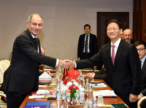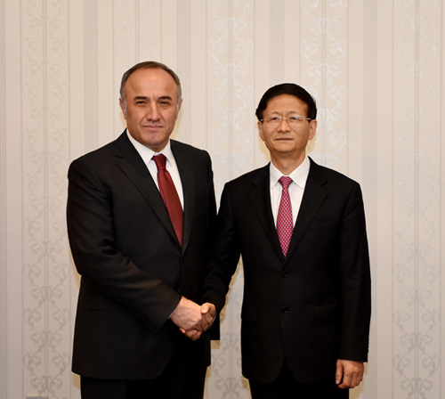 11月18日至19日,习近平主席特使、中共中央政治局委员、中央政法委书记孟建柱对土耳其进行访问。图为11月18日,土耳其国家安全委员会秘书长哈哲穆夫提奥卢在安卡拉会见孟建柱。
