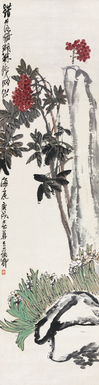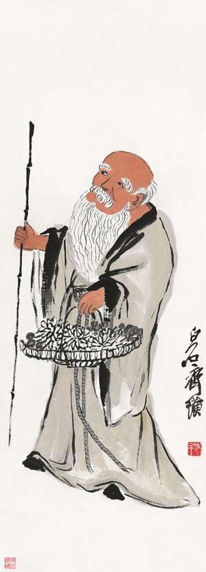 静悟堂藏画专场,17件作品,件件精要。静悟堂是一家致力于传统文化艺术品的收藏、文化开发、经营和传承的企业。本专场齐白石《持菊作寿》是白石晚年大写意人物之佳品,老者之悠闲自适、豁然舒泰的心境、神态毕现于纸上,构图开张大气,神态祥和生动。齐白石《传家宝》1944年所作,画题:“客见予画家山农器物,喜于形色,又欲攫去。予问:居都市久矣,安能思及旧物?客答:爱之,以寄情也。予大喜,即题数字一并与之……” 老人的质朴与可爱油然而现。徐悲鸿《双喜图》作于1946年,以树干横切画面,分散的树叶和喜鹊竖分,营造出很多小空间,淡彩树叶间两只喜鹊黑白分明,充满了韵律感和节奏感,枝叶随风飞扬,整个画面生动活泼。此外,任伯年的《牡丹栖禽图》、李可染的《放牧图》《三牛图》、陆俨少的《广教寺图》、何海霞的《延安颂》等都是不可多得的佳构。