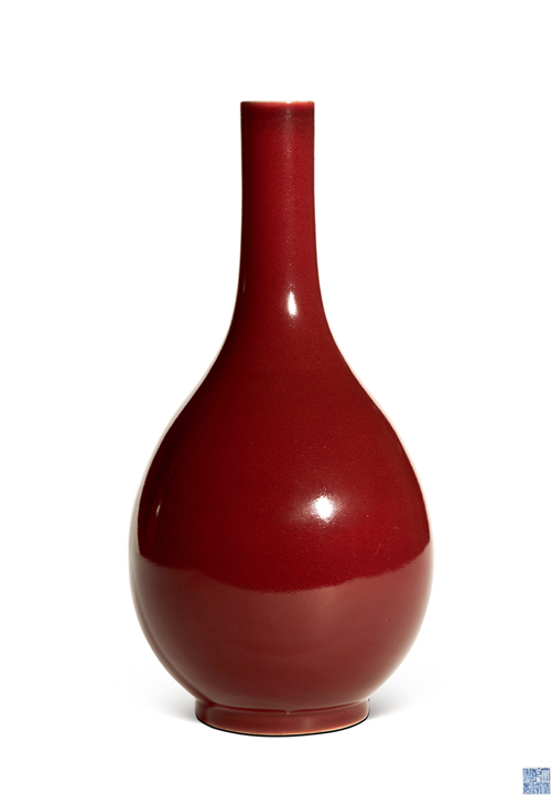 清乾隆“黄地粉彩开光花卉纹壁瓶”为乾隆御制壁瓶当中之一类,是以黄釉为地绘以缠枝莲纹,中心描金开光内白底绘马莲花,底部四字描金官款。其涂绘精细,质感分明,粉彩柔和淡雅,在黄地映衬之下,倍显清新雅致,为乾隆壁瓶中之精品。清雍正“粉青釉浮雕如意纹撇口盌”,造型典雅隽秀,端庄稳重,简洁明快,体现了雍正朝瓷器造型傲视古今的线条美。此前苏富比香港曾拍出同类器物一件,最终以高达244万圆港币成交。大清道光年制的“窑变釉石榴尊”,全器满施窑变釉,釉面晶莹润洁,红蓝晕散交融,几缕紫蓝色釉下垂形成六条蓝色条形装饰,与腹部的红釉烘托出明亮艳丽的热烈气氛。石榴尊始烧于雍正时期,此器造型端庄,线条饱满,釉彩自然垂落,别具情趣。石榴象征家族血脉之延续兴旺,宫中陈设石榴尊寄托了皇帝对多添皇子、皇孙的期盼。清乾隆“霁红釉胆瓶”,其足、胎质均洁白细腻,淘洗精炼,造型优美,比例协调,为乾隆胆瓶的典型造型,外壁施红釉,釉色红润艳泽,内及底,施白釉,外底心青花书“大清乾隆年制”六字三行篆书款,款识书写工整,青花发色青翠明快。