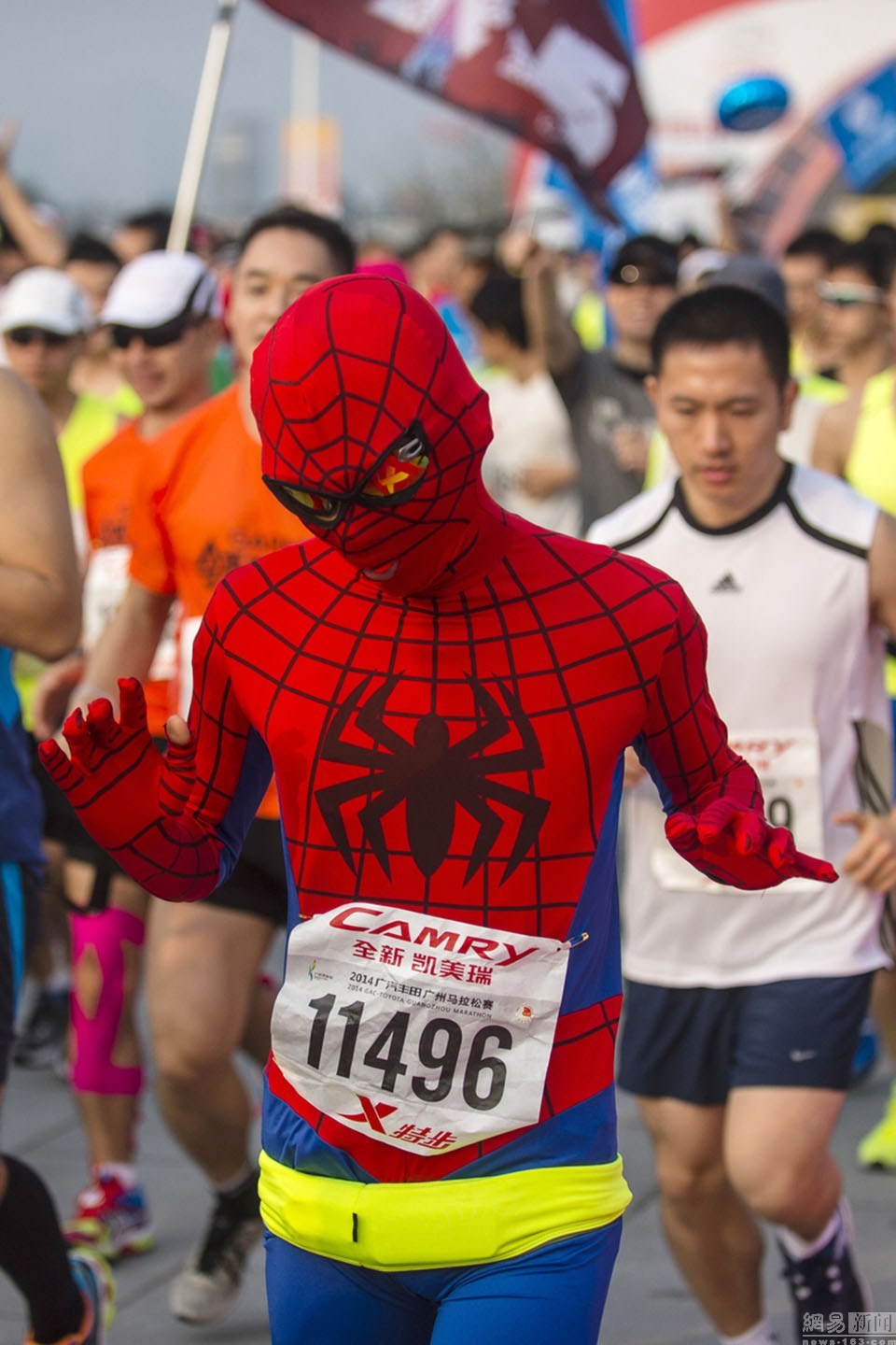 2014年11月23日,上午8时,2014广州马拉松鸣枪开跑,来自40个国家和地区的20000名参赛选手开跑。大批参赛者上演cosplay秀。文信/东方IC