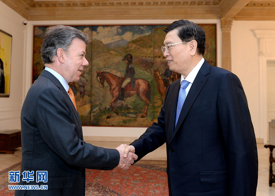 11月24日,正在哥伦比亚进行正式友好访问的全国人大常委会委员长张德江在波哥大会见哥伦比亚总统桑托斯。 新华社记者 刘建生 摄