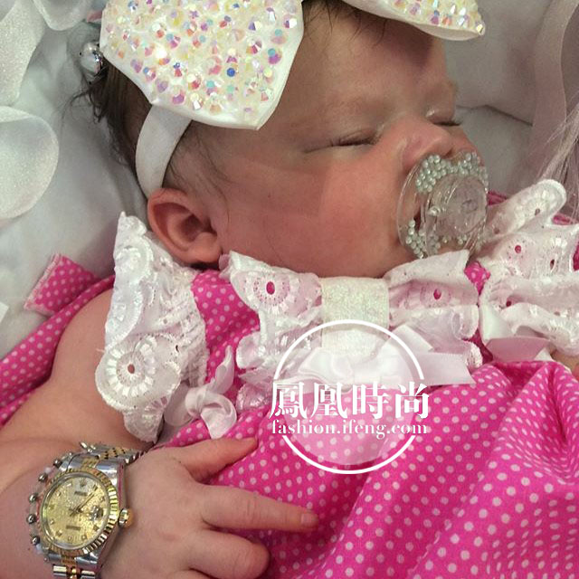 近日,外媒曝光了一张5个月土豪宝宝的照片,小肉手腕挂着劳力士手表,口里叼着镶钻奶嘴正在熟睡。20岁的妈妈表示想让宝宝拥有所有钱可以买到的东西。这位土豪宝宝名叫Romany Rose。