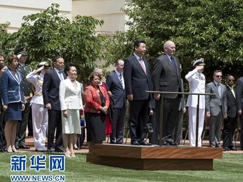 11月17日,中国国家主席习近平在堪培拉会见澳大利亚总督科斯格罗夫?;峒?,科斯格罗夫在总督府草坪为习近平举行隆重欢迎仪式。习近平和夫人彭丽媛抵达时,受到科斯格罗夫总督夫妇热情迎接。新华社记者李学仁 摄