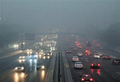 昨日下午4时30分左右,建外大街,雾霾中行驶的车辆都亮起车灯。今日受强冷空气影响,空气污染过程将结束。新京报记者尹亚飞摄
