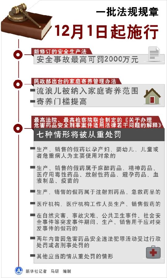 ?。保苍拢比掌?,一批新的法规规章开始施行。每个寄养家庭最多能寄养几名儿童?企业安全事故最高会被罚多少钱?哪些制售假药、劣药的违法犯罪行为将被从重处罚?这些都在新规中得到明确。