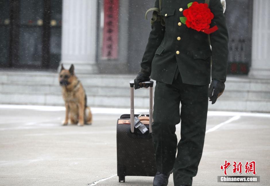 2014年11月30日,退役哨兵熊星与军犬“小龙”告别。中新社发 魏建顺 摄   图片来源:CNSPHOTO