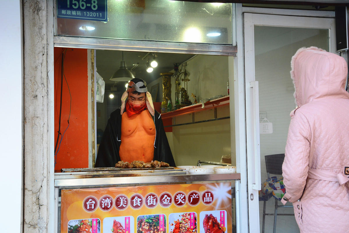 窗口柜台后,一个穿着“黑僧衣”,戴着“黑僧帽”,脖围红纱巾,露着大肚腩,撅着猪鼻子,耷拉一对猪耳朵的“猪八戒”烤起猪蹄。过往行人被“二师兄”的形象吸引,纷纷近前一探究竟。走近后,行人马上又被烤炉上金黄色的猪蹄和浓郁的香味勾起馋虫,忍不住花10块钱买半个猪蹄尝尝。
