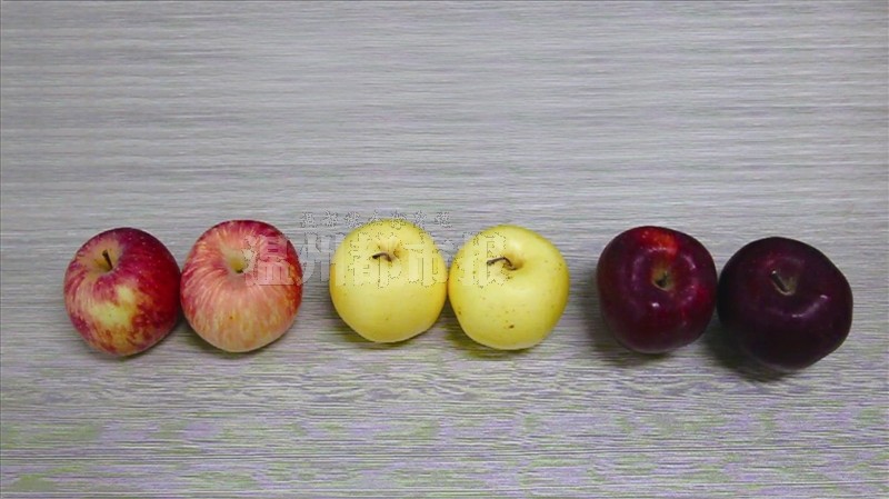冰糖心红富士、黄金帅和蛇果三种苹果各2只,分为实验组和对照组。记者王诚/摄