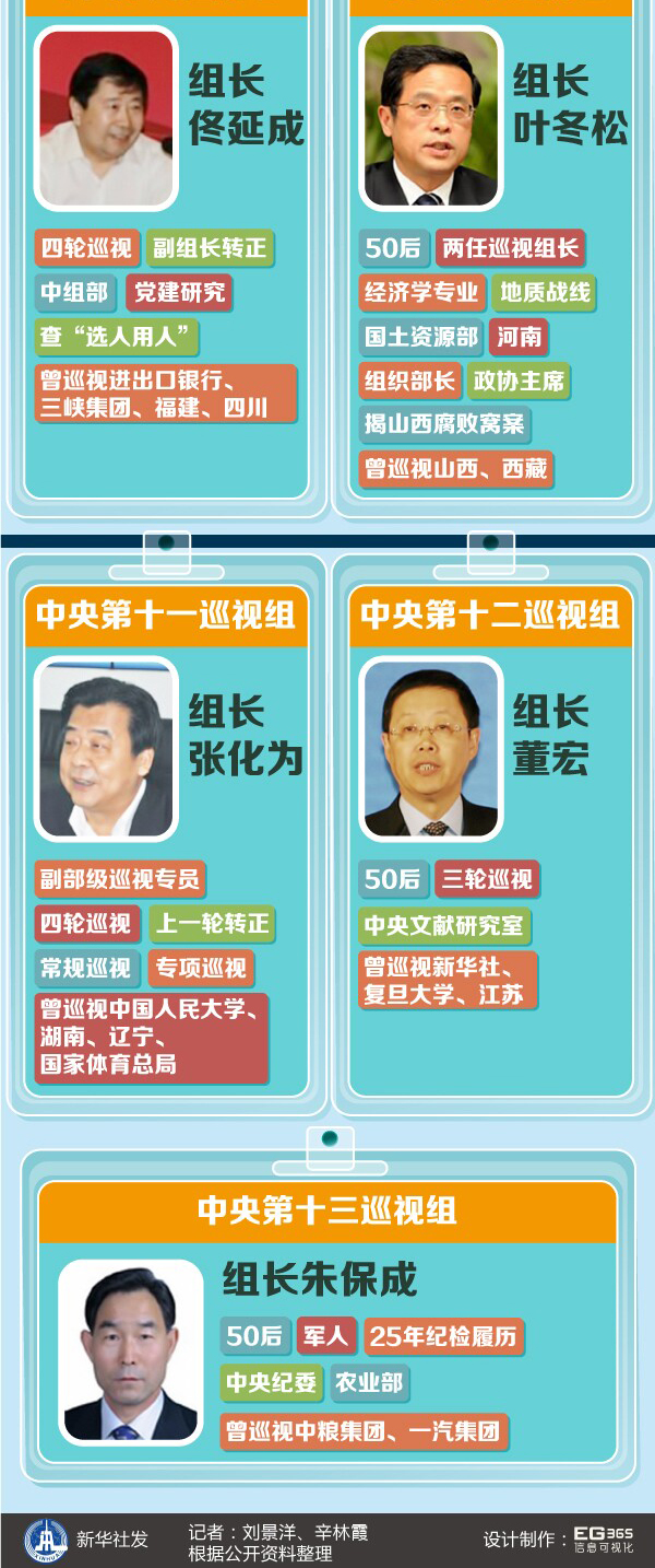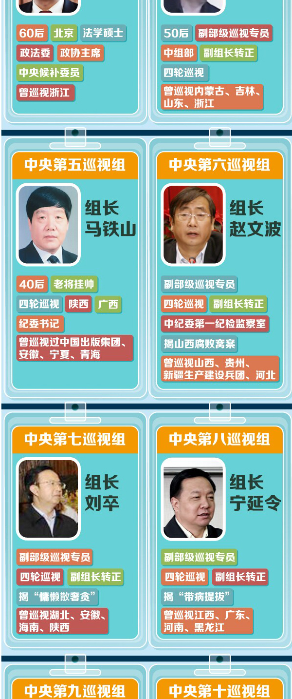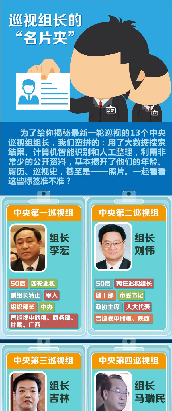 为了给大家揭秘最新一轮巡视的13个中央巡视组组长,新华社“中国网事”记者利用大数据搜索结果、计算机智能识别、人工整理以及极少的公开资料,基本揭开了他们的履历、巡视史。有图有真相。一起看看准不准?