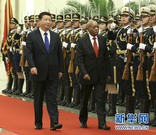 会谈前,习近平在人民大会堂北大厅为祖马举行欢迎仪式。习近平主席夫人彭丽媛、全国人大常委会副委员长沈跃跃、国务委员杨洁篪、全国政协副主席王正伟等出席。