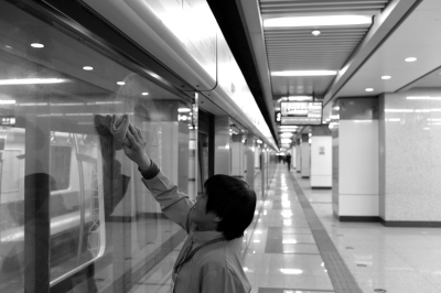 昨天,即将通车的7号线双合站,保洁员在擦拭玻璃。京华时报记者王海欣摄