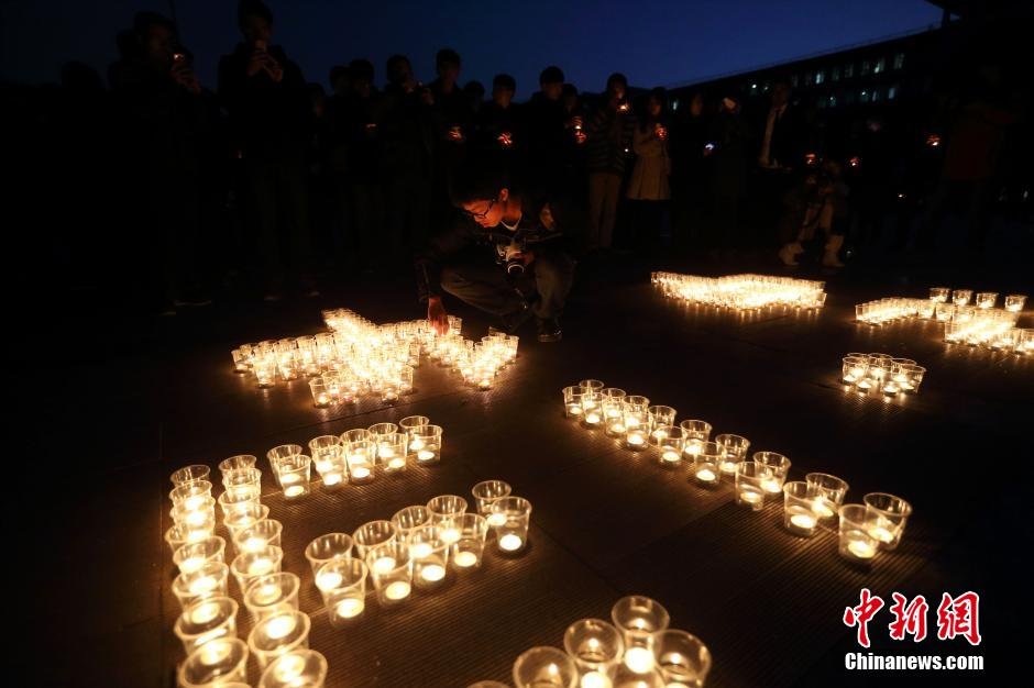 12月5日晚,在侵华日军南京大屠杀死难者国家公祭日即将来临之际,江苏南京四百多位大学生点燃烛光,摆放成“12·13”、“中华”字样,同时在宿舍楼用灯控的方式组成“12·13”,用最为朴素的方式铭记历史、悼念遇难同胞。1937年12月13日,侵华日军攻陷南京后,犯下了大规模屠杀、抢掠、强奸等战争罪行。 中新社发 泱波 摄