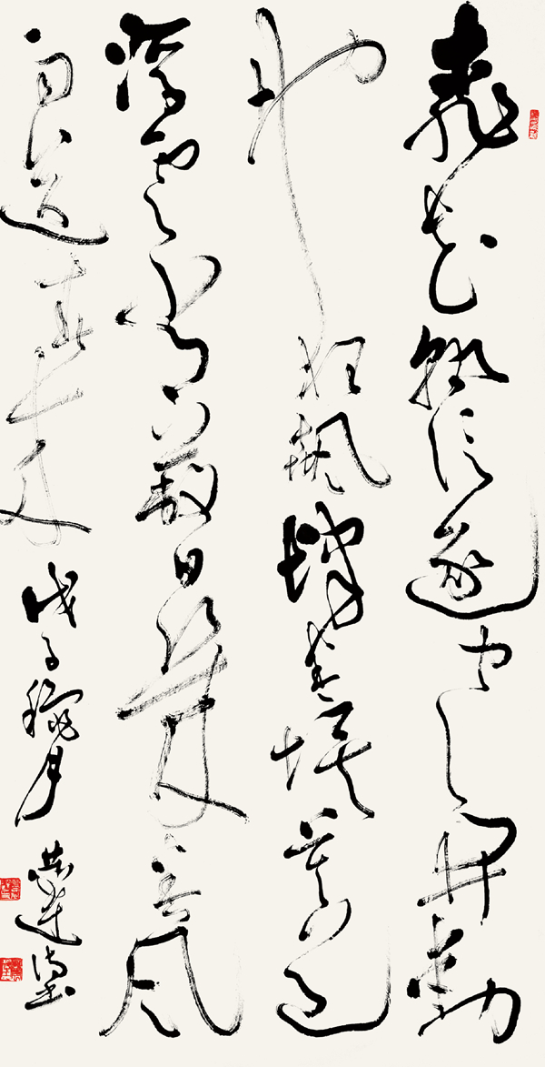 历史的积淀形成了中国传统的人文精神。中国书法包蕴的人格理想包涵着人类的最高理想。艺术创作的心理体验是书法家心灵与人类原始精神的交融,是对宇宙生命和自我生命的双重感悟。中国古代对书法的理解是以人文理念为根本支点,从书法的内在精神到技法体系,都具有深厚的人文内涵。其思想源是老庄的“天人合一”,其审美情趣是“虚静”。因此,当代书法的历史使命是用中国人文艺术的“元语言”融合时代精神去构建当代书法艺术语言与视觉图式。