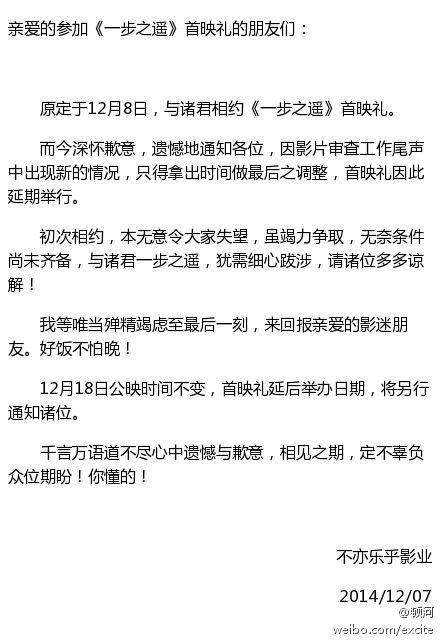 新浪娱乐讯 继《让子弹飞》后,姜文时隔4年终于要推出新作《一步之?!?。不过就在上映前,片方屡次取消为媒体安排的公开放映,甚至在原定12月8日首映礼的头一天晚上对外发布声明称首映礼延期举行。而7日晚导演姜文在参加某活动时更语焉不详的表示,“希望《一步之?!凡还几捍蠹业钠谕?,能够如期上映。”这些一反常态的行为,被媒体解读为,《一步之遥》很有可能还没有过审,甚至有不能如期公映的危险。不过当晚片方已发布声明表示12月18日的上映日期不变。