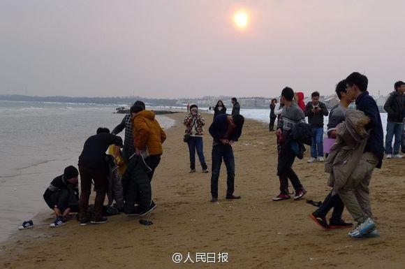 救人现场。参与救人的学生陈学沛告诉记者,女子被救回岸上后,大家看到她只穿了件黄色连衣裙,有同学把防寒服给她披上,不过该女子披了一会就还给了同学,没说什么就与岸上的同伴汇合,披上同伴的衣服离开了。