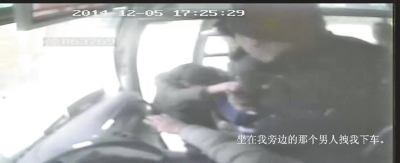 事发时的监控录像截图(画面显示文字为受害人陈述) 嫌犯挟持受害人下车,司机疑似打了个手势