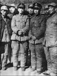 1948年11月8日,原国民党第三绥靖区副司令官何基沣、张克侠两将军率部起义开赴山东解放区和前来欢迎的华东军区代表陈同生合影。前排左起:陈同生、张克侠、何基沣、孟绍濂;后排左一为杨斯德。