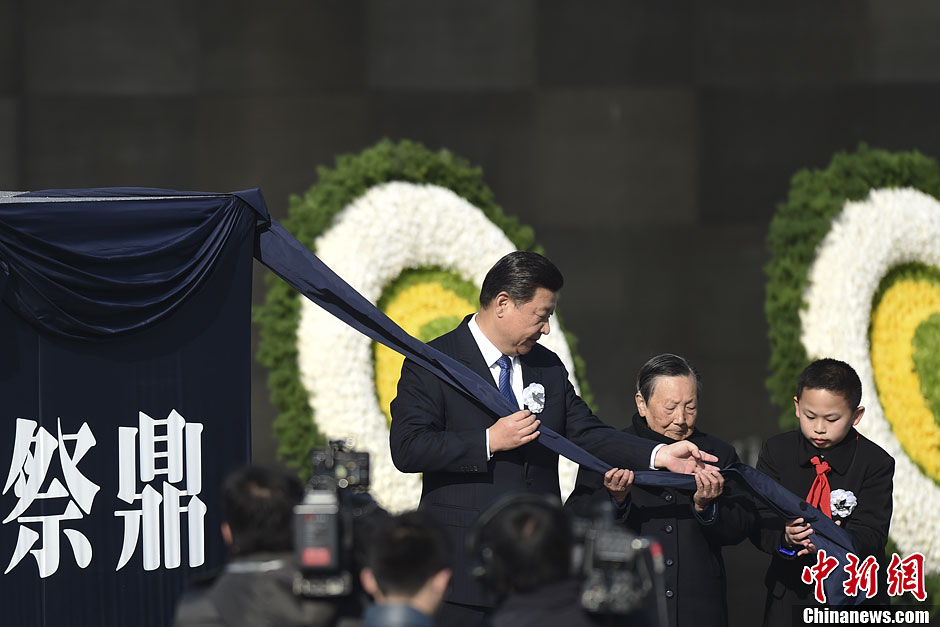 12月13日是首个南京大屠杀死难者国家公祭日。当天上午10时,国家公祭仪式在侵华日军南京大屠杀遇难同胞纪念馆举行。中共中央总书记、国家主席、中央军委主席习近平与南京大屠杀幸存者代表、少先队员代表为国家公祭鼎揭幕。中新社记者 廖攀 摄