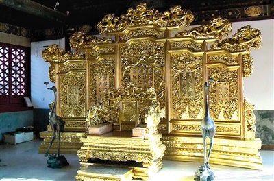 昨日,嵩祝名院所在的嵩祝寺及智珠寺内,一处被用作餐厅的古建筑内摆放着一张“龙椅”,这张“龙椅”是按照故宫里的龙椅等比例制作的(视频截图)。新华社记者 李德欣 摄