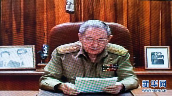 这是12月17日在古巴首都哈瓦那拍摄的劳尔·卡斯特罗发表电视讲话的截图画面。美国总统奥巴马与古巴国务委员会主席兼部长会议主席劳尔·卡斯特罗17日分别发表讲话,宣布将就恢复两国外交关系展开磋商。 新华社记者刘彬摄