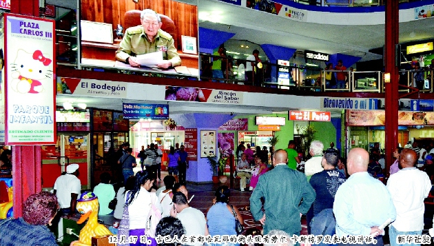 12月17日,古巴人在首都哈瓦那的街头观看劳尔·卡斯特罗发表电视讲话。 新华社发