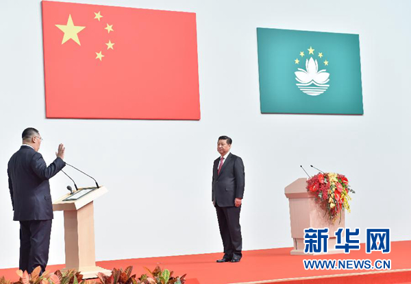 12月20日,庆祝澳门回归祖国15周年大会暨澳门特别行政区第四届政府就职典礼在澳门东亚运动会体育馆隆重举行。中共中央总书记、国家主席、中央军委主席习近平出席。这是习近平监誓,澳门特别行政区第四任行政长官崔世安宣誓就职。新华社记者李涛 摄