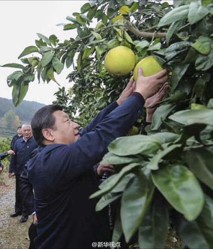 【现场】2013年11月3日,湘西州。山道狭窄,看到背着满篓柚子的村民,习近平问“重不重?”听说有五六十斤,他赶紧侧身说“你快走吧,背着很重”。枝头挂满柚子,村民们正在采摘,习近平捧住一个柚子,轻轻一拧就摘了下来。一连轻松摘了两个,他幽默地说:“这是技术活啊。”