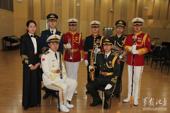 解放军军乐团军乐手展示不同礼仪场合穿着的新式礼宾服。