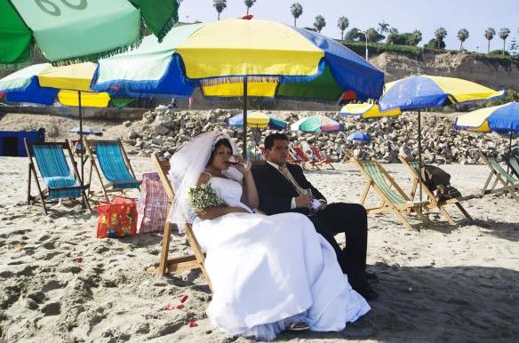 2010年2月12日,利马,一对新婚夫妇正在沙滩上休息,一会他们要举行萨满仪式婚礼。