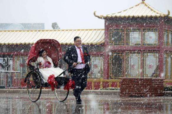 2013年3月30日,中国,山东威海,一名男子正在婚礼仪式上用人力车拉着他的新娘。