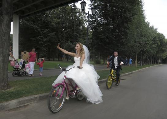 2013年8月15日,莫斯科,叶琳娜与他的丈夫正骑自行车经过高尔基公园,他们是在一天前刚刚完婚的,此刻叶琳娜正挥手同过路人打招呼。