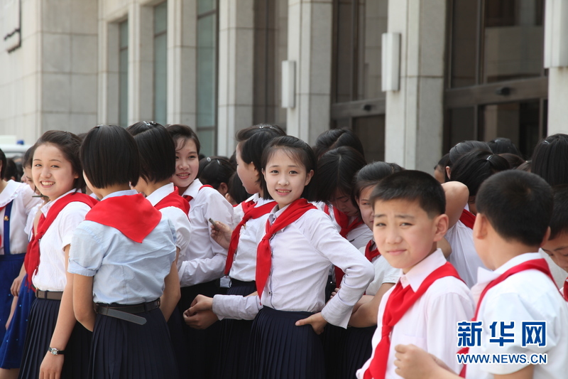2012年,朝鲜最高领导人接见朝鲜“少年团”,记者跟随“少年团”成员到达位于平壤著名的万景台少年宫,女学生们身着白色上衣和蓝色学生裙,脖子上身系红领巾,她们的一颦一笑,让人印象深刻。图为记者采访金元钧平壤音乐大学时的学生。新华社记者曾涛摄
