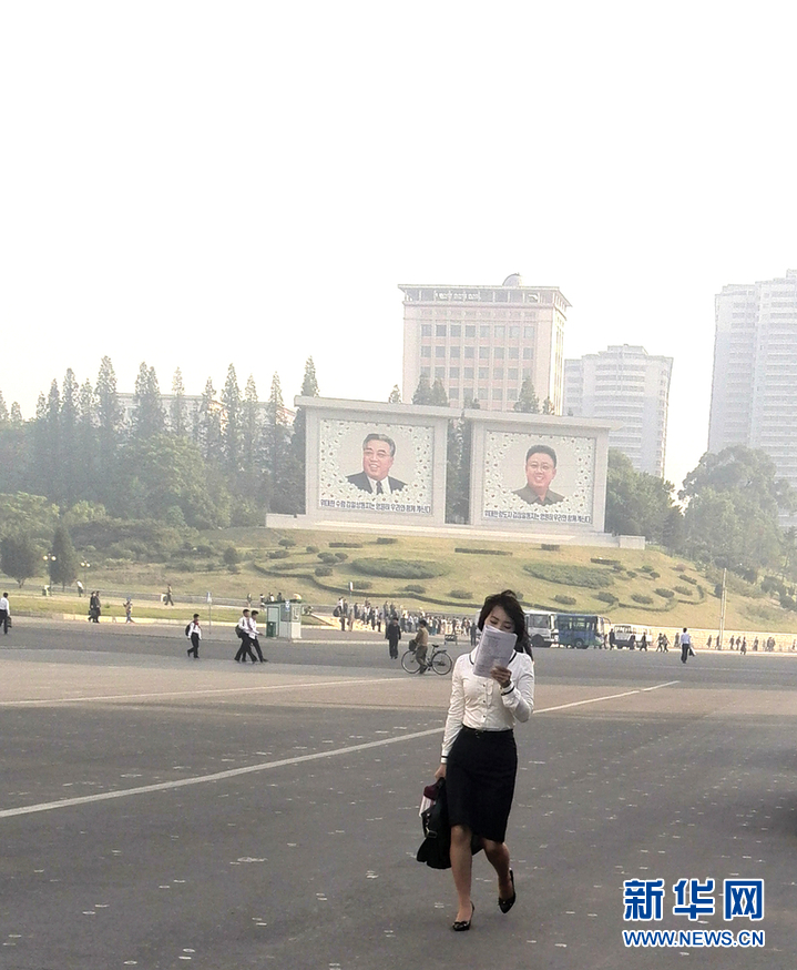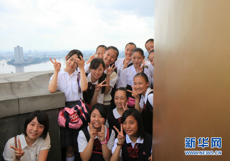 主体思想塔“上偶遇的在日朝侨学生。新华社记者曾涛摄