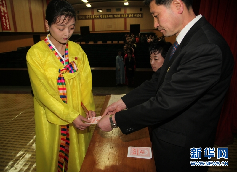 每五年一次的朝鲜最高人民会议代议员选举投票站的投票者。新华社记者曾涛摄